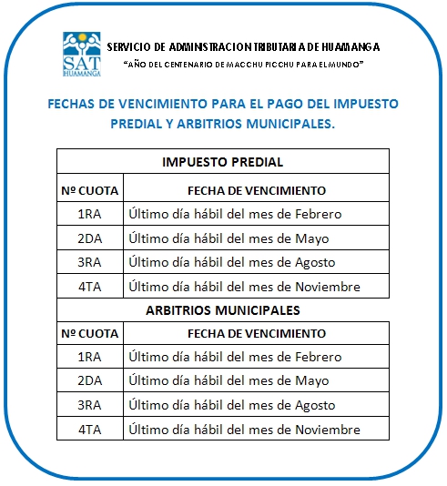 Fechas de Vencimiento para el pago del Impuesto Predial y Arbitrios Municipales